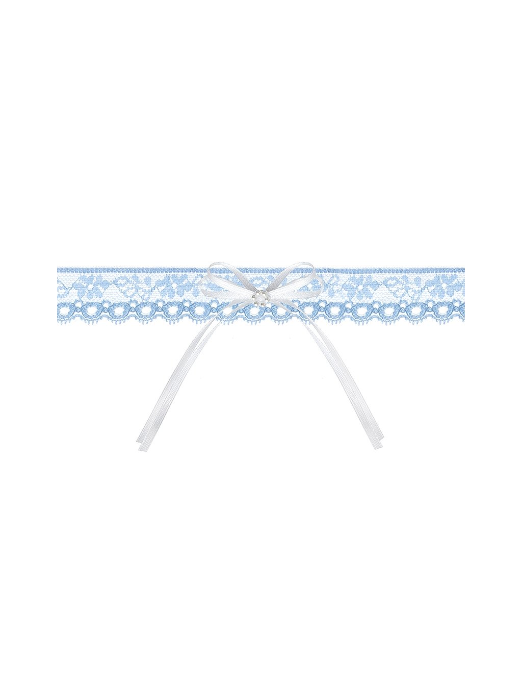 Podvazek je vyroben z modré krajky a doplněn drobnou bílou mašličkou. Barevná kombinace je nenápadná, ale na detailních fotografiích krásně vynikne. Styl je nadčasový a snadno se kombinuje s dalšími svatebními doplňky.
