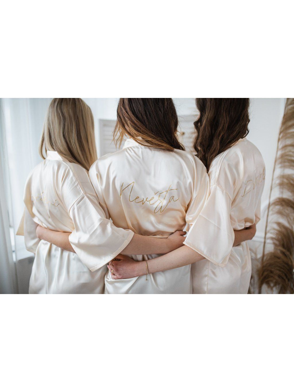 Krémový svatební župánek s luxusním zlatým potiskem „Družička“ je ideální volbou pro ranní přípravy, líčení i svatební focení. Perfektní...